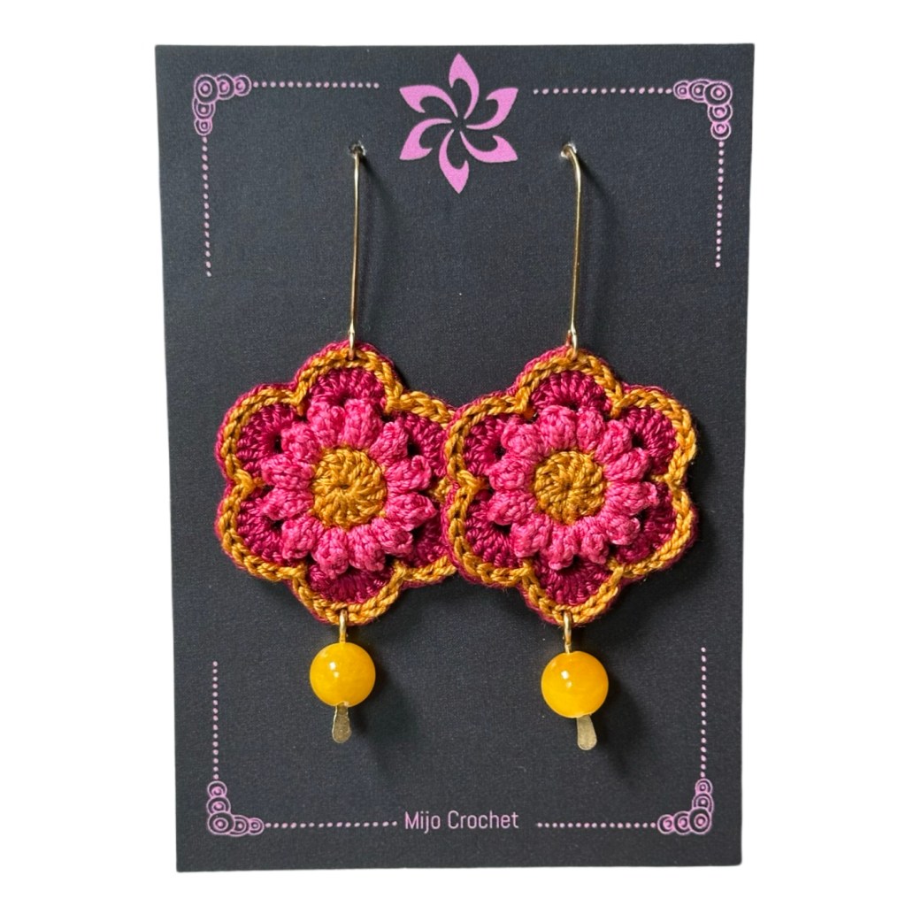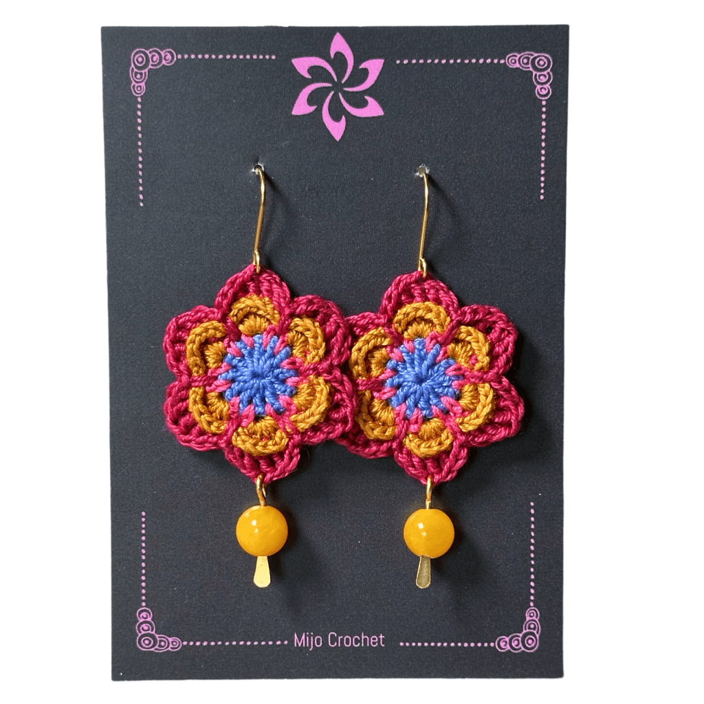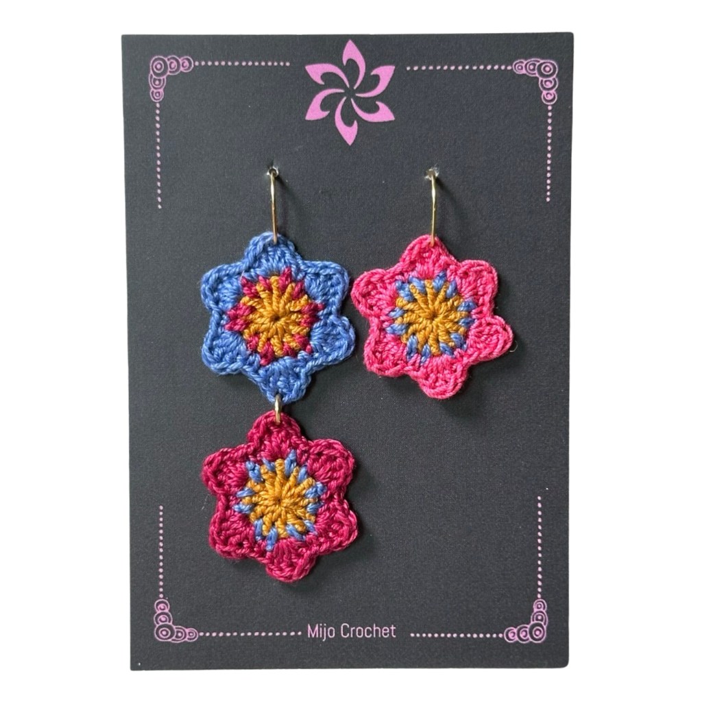 The Jewelry Flowers pattern gives you five different flower motifs that can be used to make earrings, necklaces, brooches, keychains, flower wreaths, appliques for bags and clothes etcetera. The flowers are made with cotton lace yarn to keep the size small and also to make them more firm. Mix and match your favorites and play with colors!
